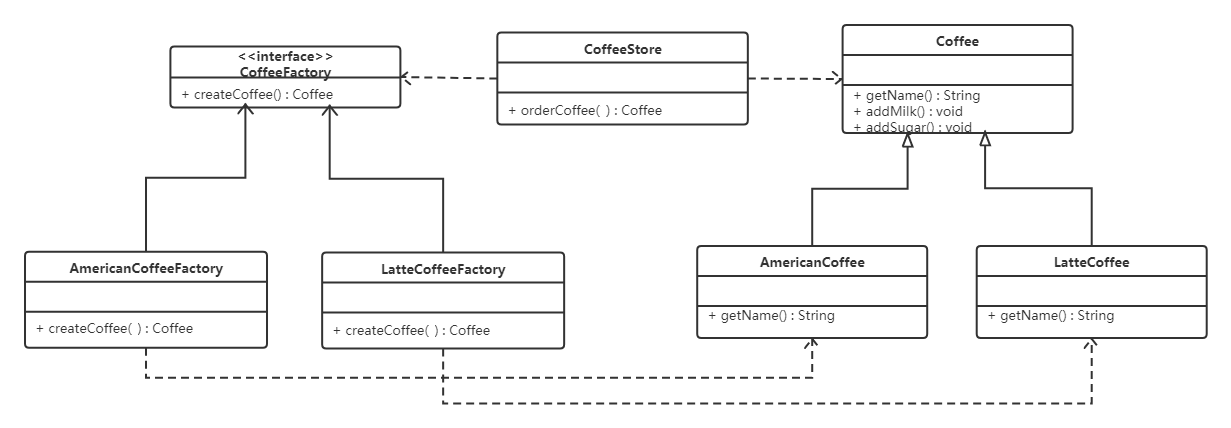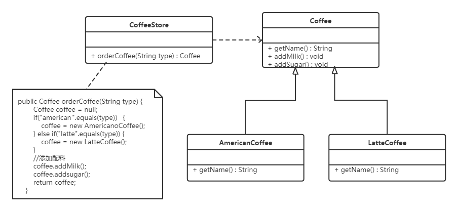 工厂(factory)处理创建对象的细节,一旦有了 SimpleCoffeeFactory,CoffeeStore 类中的 orderCoffee () 就变成此对象的客户,后期如果需要 Coffee 对象直接从工厂中获取即可。这样也就解除了和 Coffee 实现类的耦合,同时又产生了新的耦合,CoffeeStore 对象和 SimpleCoffeeFactory 工厂对象的耦合,工厂对象和商品对象的耦合。