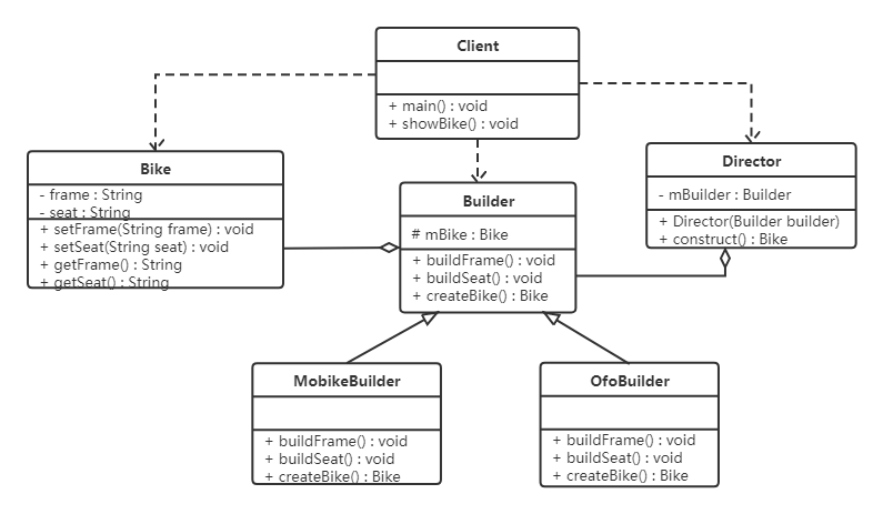 上面示例是 Builder 模式的常规用法,指挥者类 Director 在建造者模式中具有很重要的作用,它用于指导具体构建者如何构建产品,控制调用先后次序,并向调用者返回完整的产品类,但是有些情况下需要简化系统结构,可以把指挥者类和抽象建造者进行结合