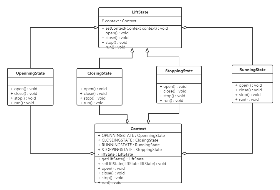 对上述电梯的案例使用状态模式进行改进。类图如下: