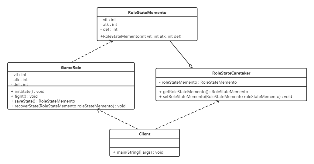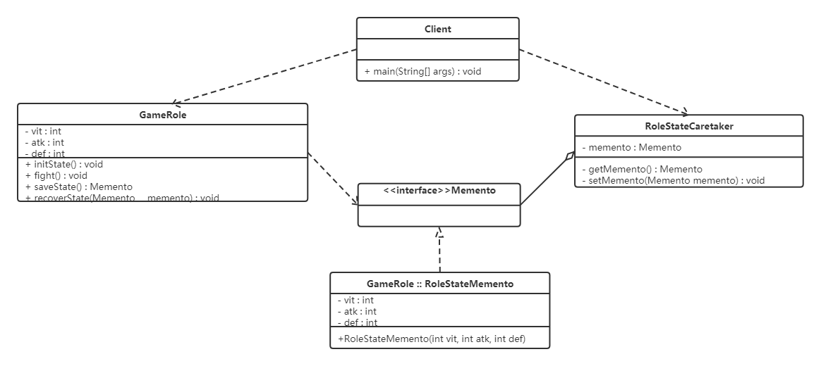 将 RoleStateMemento 设为 GameRole 的内部类,从而将 RoleStateMemento 对象封装在 GameRole 里面;在外面提供一个标识接口 Memento 给 RoleStateCaretaker 及其他对象使用。这样 GameRole 类看到的是 RoleStateMemento 所有的接口,而 RoleStateCaretaker 及其他对象看到的仅仅是标识接口 Memento 所暴露出来的接口,从而维护了封装型。类图如下: