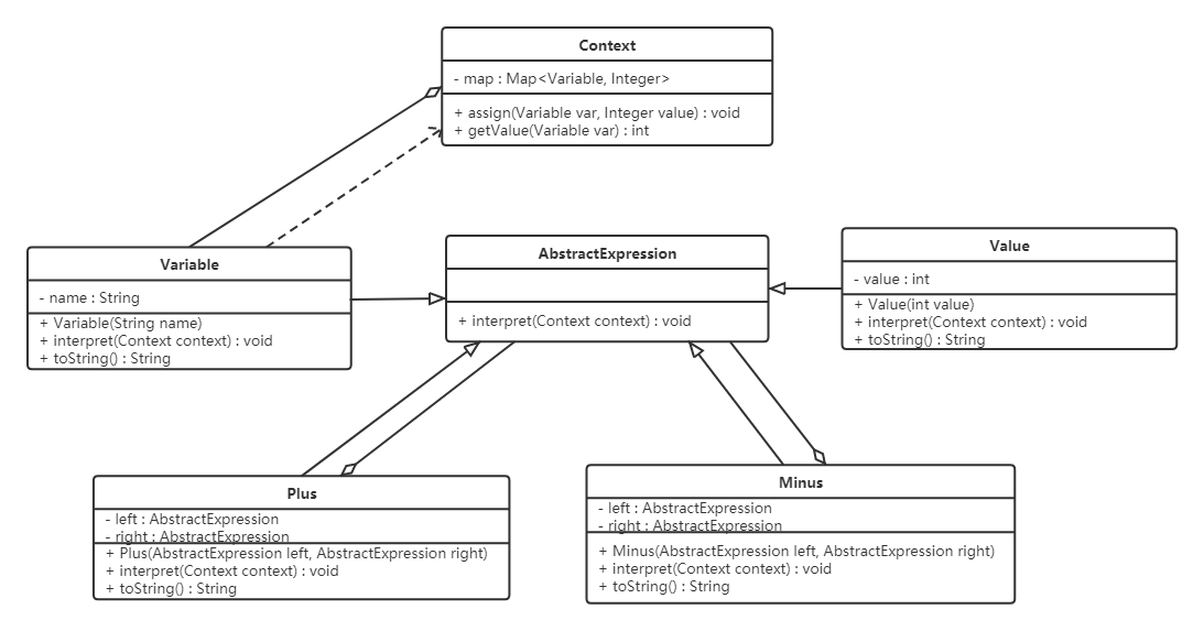 - 客户端(Client):主要任务是将需要分析的句子或表达式转换成使用解释器对象描述的抽象语法树,然后调用解释器的解释方法,当然也可以通过环境角色间接访问解释器的解释方法。